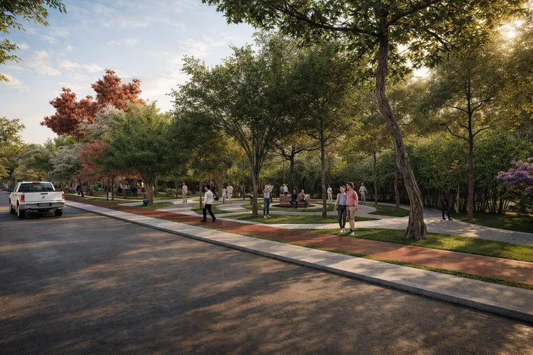 El verde y el espacio público se integran al entorno residencial, creando una experiencia más tranquila, cercana y humana.